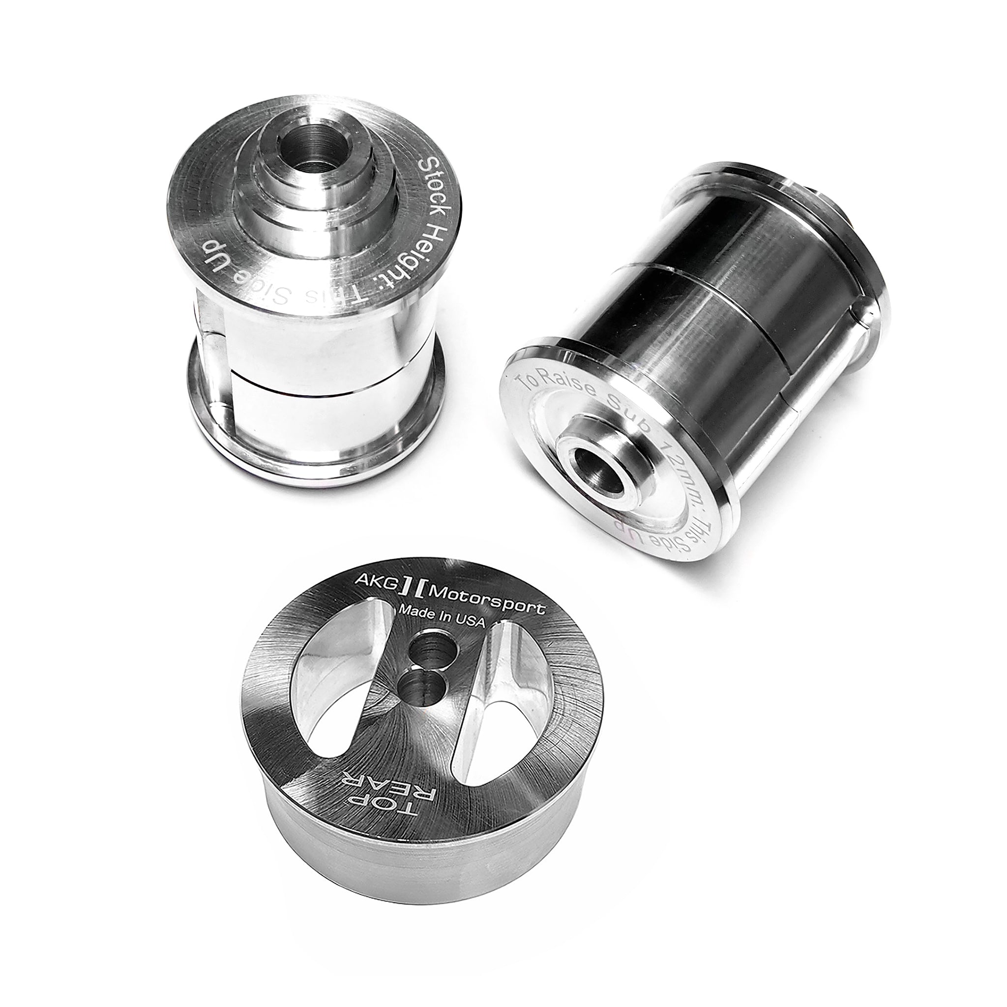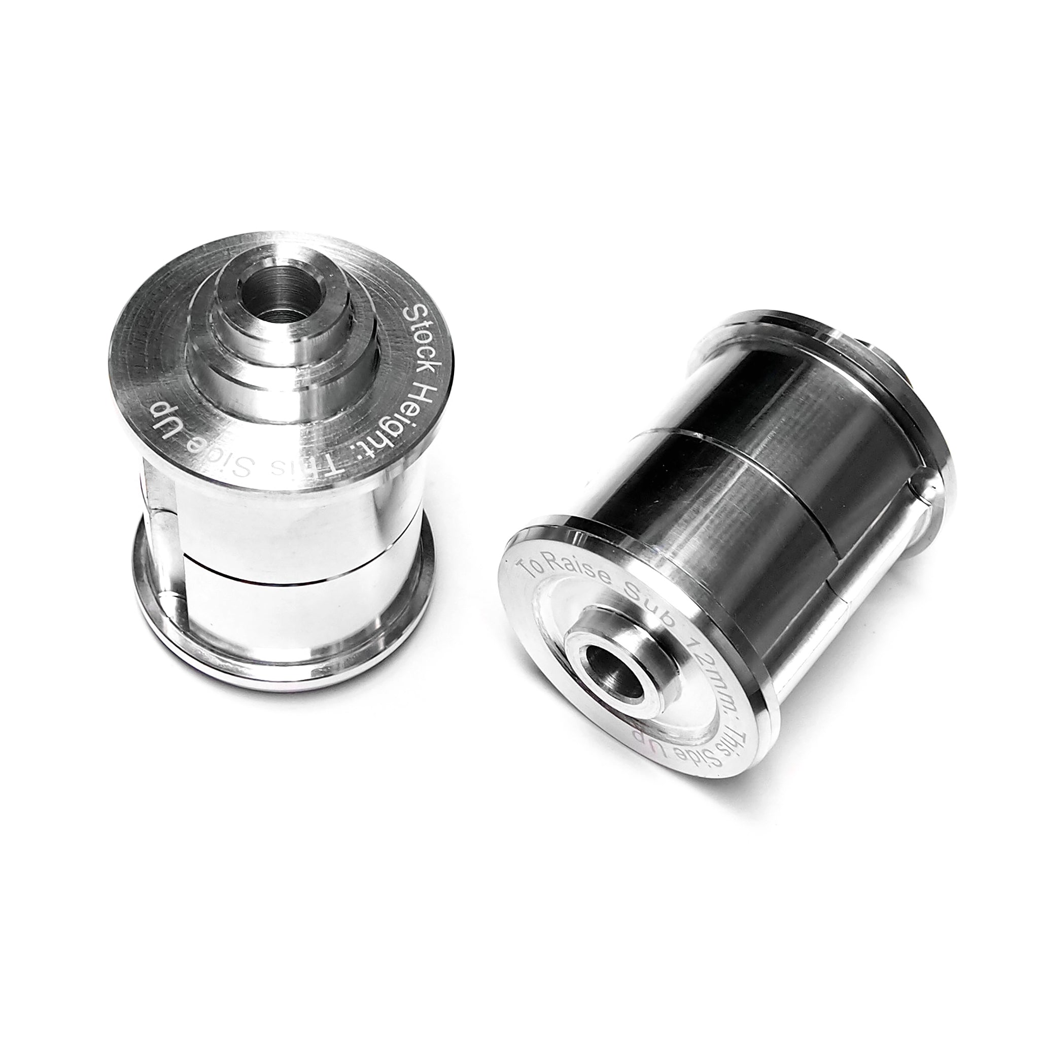 These innovative BMW E30 aluminum rear subframe bushings are adjustable to allow for for either the stock rear subframe height, or (when flipped) raise the subframe 12mm to adjust for extreme negative camber! An optional offset diff bushing is available to make an easy adjustable kit.
