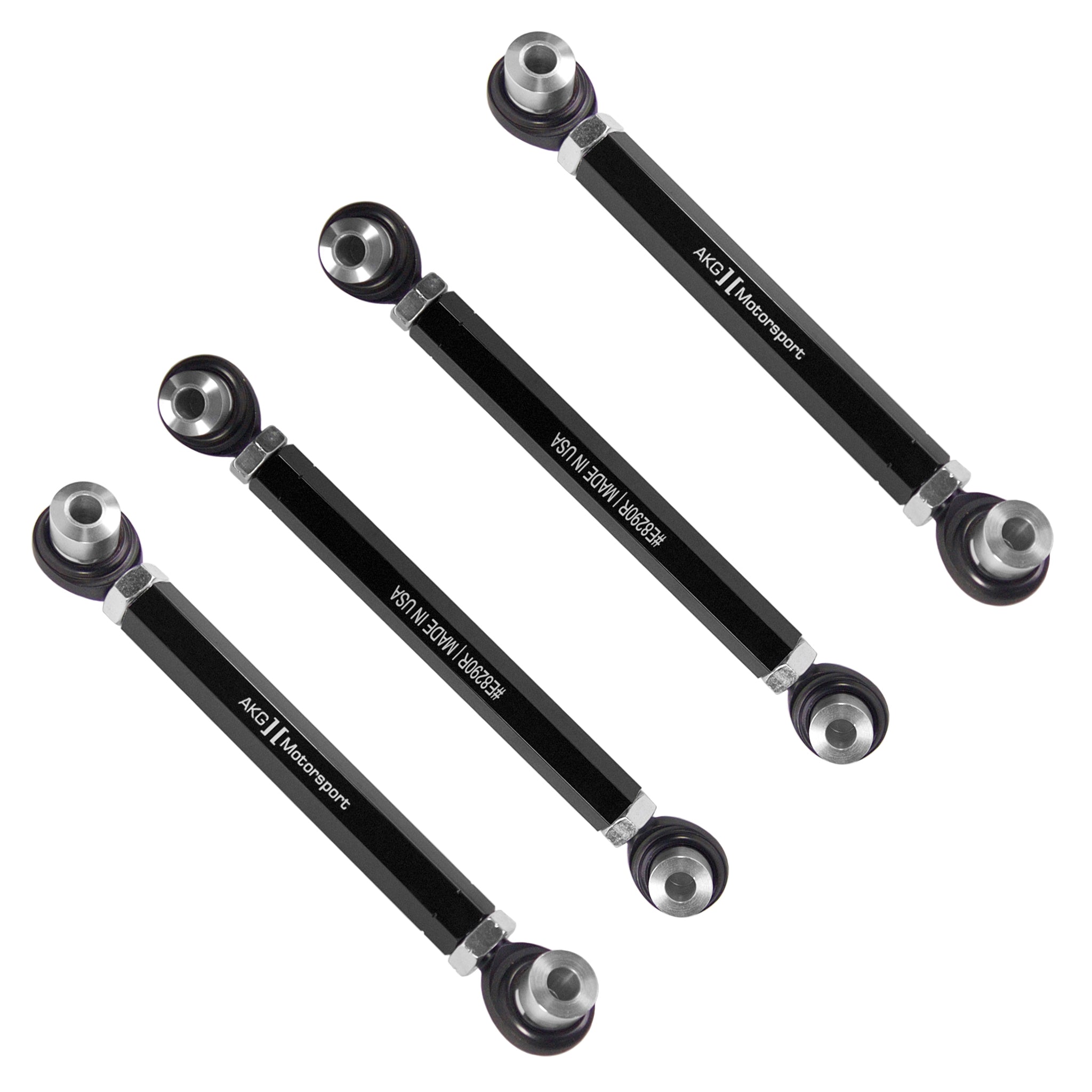 Our BMW rear camber arms are made of high-quality 6061-T6 anodized aluminum rods with premium, Teflon-lined race-spec rod ends. The spherical bearing spacers are precision CNC'd of 6061-T6 aluminum and are designed for high-strength as well as proper fitment. Set of four upper adjustable arms (two camber arms, two guide rods). Professional installation recommended.