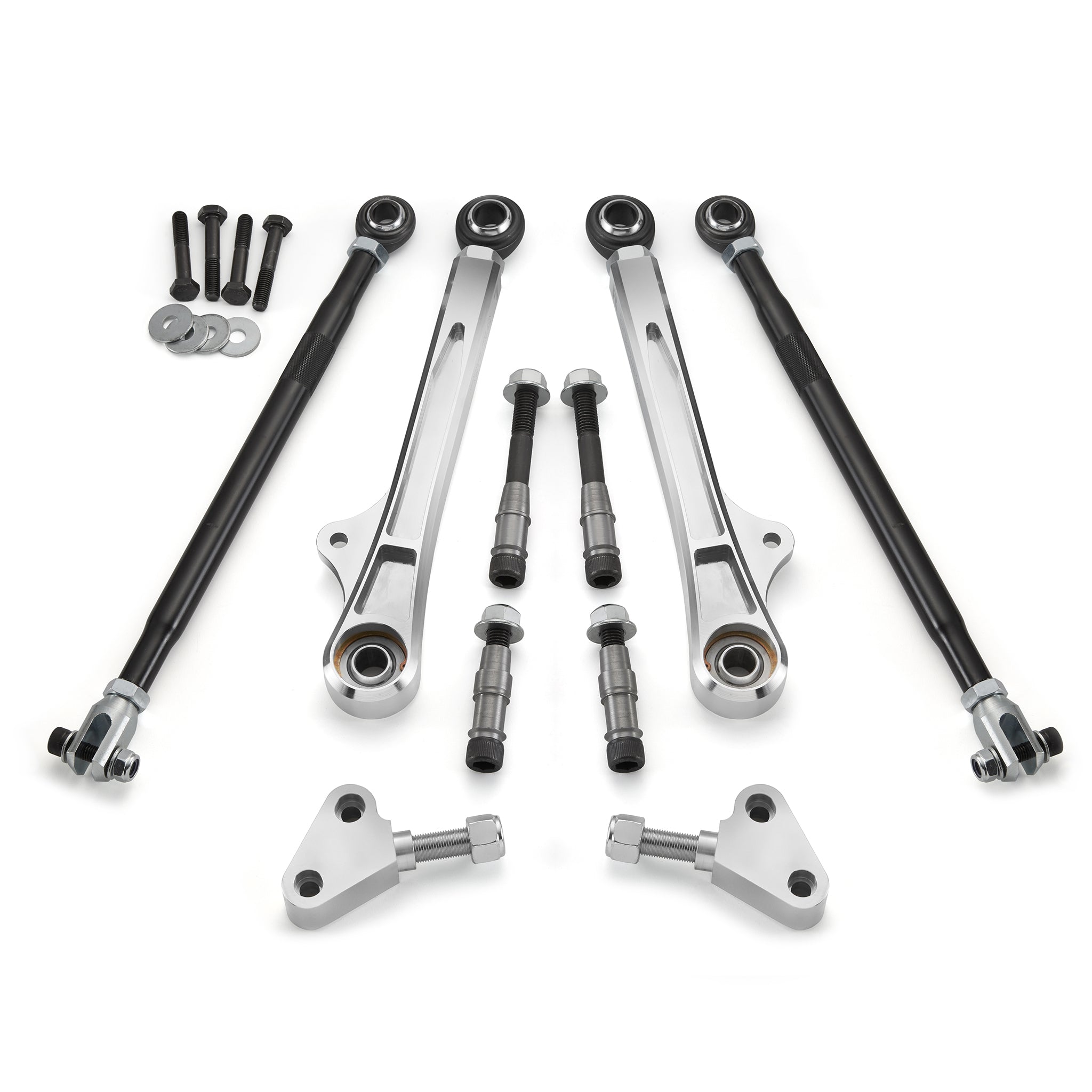 Our adjustable front control arms are made of high-quality, CNC'd extruded 6061 T6 (or 7075 T6) aluminum arms and mount brackets, with lightweight DOM steel track-rods. High-quality, Teflon-lined race-spec bearings throughout. Heavy-duty hardware included. Professional installation recommended.