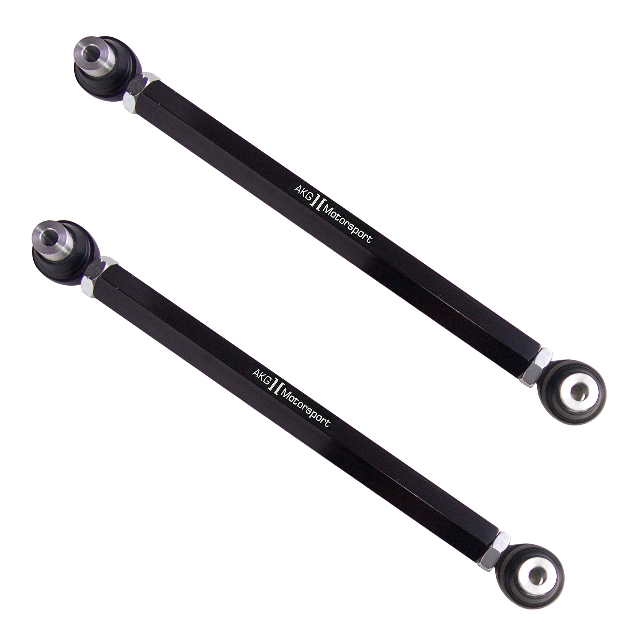 Our BMW rear toe arms are made of high-quality 6061-T6 anodized aluminum rods with premium, Teflon-lined race-spec rod ends. The spherical bearing spacers are precision CNC'd of 6061-T6 aluminum and are designed for high-strength as well as proper fitment. Professional installation recommended. Set of two adjustable toe arms.